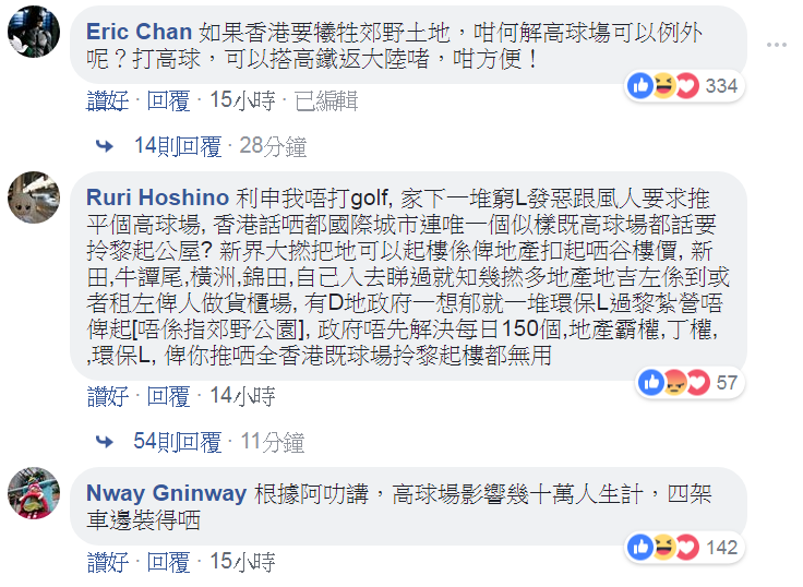 有網民不滿香港要犧牲公共的郊野土地而保留高球場,認為富人可到大陸打高爾夫球,不應影響其他市民的居屋權利。亦有網民指當局封鎖入口是合情合理,又認為高球場有其價值應作保留,並指政府若不減少內地移民數字,即使再開發更多土地建屋仍然難以解決問題。